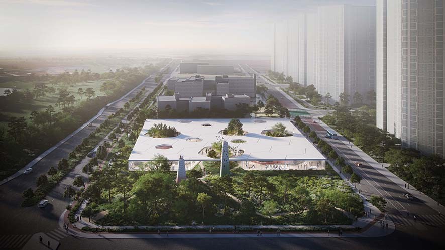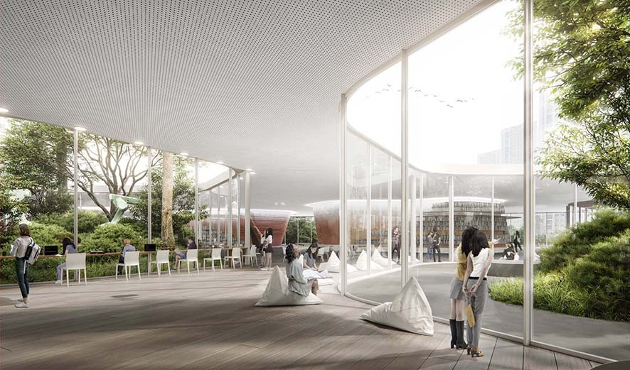 Kütüphane ortak olarak kullanılan bir peyzajda Songdo’nun sosyal yaşamını harekete geçirmek ve öğrenim için açık ve interaktif bir alan sunmak için tasarlandı. Peyzajında şairin bahçesinin tarihinden esinlenildi. Şairin bahçesi doğada inzivaya çekilme ve alimlerin aydınlanma ve doğa ile bir olma arayışı için uygun ortamı sunan bir yer.