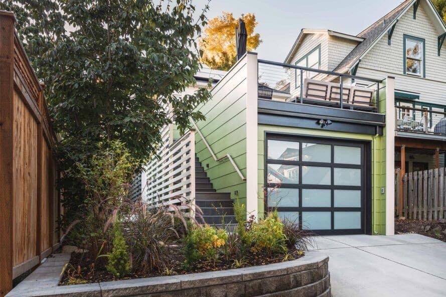 Ev sahipleri ayrıca bir garaj eklemek istediler, bu nedenle tasarım ekibi, üzerinde bir çatı güvertesi oluşturmak için eklentiyi verimli bir şekilde kullanmayı hedeflediler. Uzantı, toplanan yağmur suyuyla sulanan alt kısımdaki avluya bağlandı. Garajın içinde bir elektrikli araç şarj istasyonu bulunmakta. İlave tavan yalıtımı, güneş enerjisi dizini, LED aydınlatma, yüksek verimli cihazlar, mantar zeminler ve akıllı ev teknolojisi ile mevcut Seattle enerji kodunu aşıyor.
