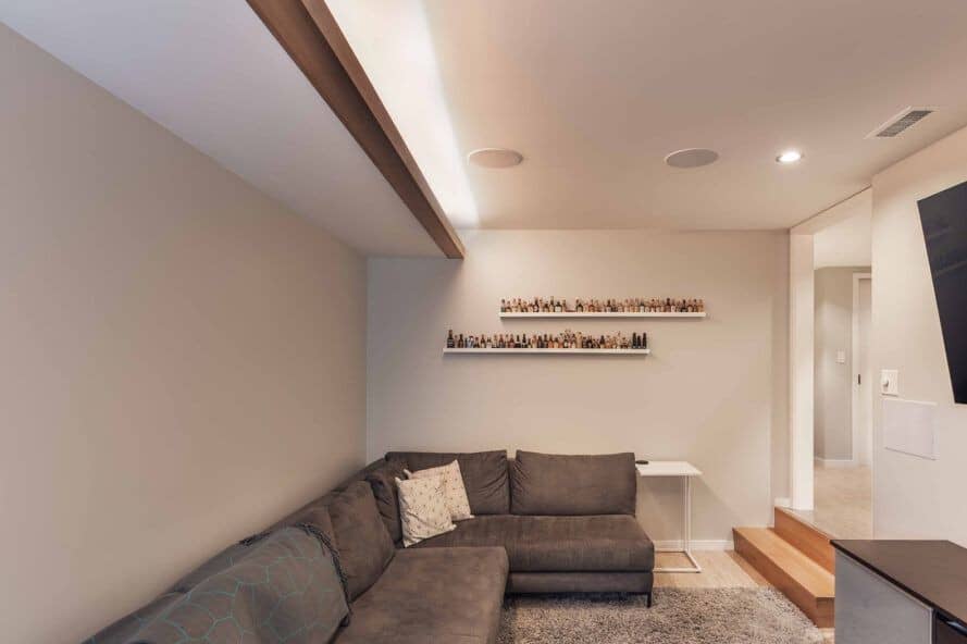 Ekip bu projeyi “önde Tudor, arkada parti” olarak adlandırdı, çünkü mevcut ev bir Tudor canlandırma bungalovuydu. Üst kat iyi durumdaydı, ancak Bodrum, bir gemideki kaptanın çeyreklerine benzemek için süslenmiş bitmiş bir yatak odası hariç, çoğunlukla bitmemişti. Alan cereyanlı ve soğuktu. Doğal bodrum soğukluğunu en aza indirmek için, yalıtımlı bir levha mevcut kaplı levhanın yerini aldı, boyunca sıkı yalıtım kullanıldı ve sıcaklık kontrolü için iki ısı pompası yerleştirildi.