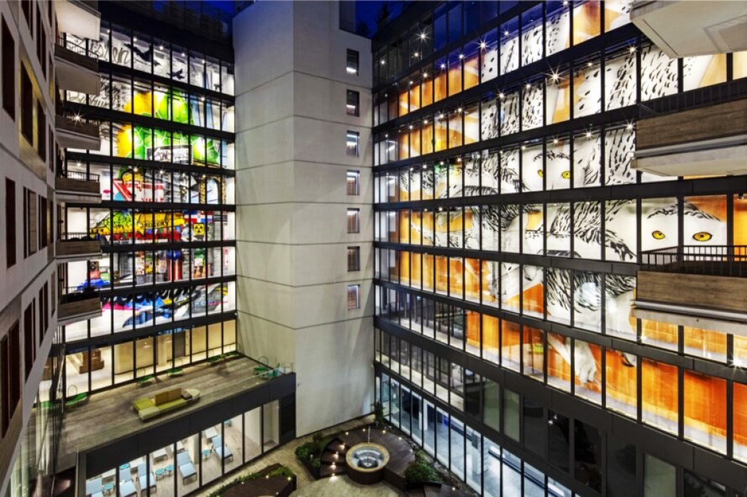 Epeyce etkileyici olan bu olanaklar binanın içinde de devam ediyor: kahve dükkanı, oyun odaları, bowling sahası, kaya tırmanış duvarı, sinema salonu ve daha fazlası. Yerel sanatçıların yaptığı on beş adet duvar resmi binaya damgasını vuruyor; bu resimleri pek çok avludan görmek mümkün, beş tanesi de halka açık parklardan görülebiliyor.