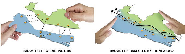 Tasarım amacımız, bir üretim kasabası olarak Bao’an’dan vazgeçmek değil, tesislerini, insanları, yerleri ve olanakları paylaşma ve birbirine bağlama gücüne sahip bir “Yeşil Üretim Şehri” haline getirmektir. Bu sürdürülebilir şehir, şeffaf fabrikalar, teslimatlar için drone limanları, deneyler için açık platformlar, mobil ofisler ve paylaşılacak doğal olanaklar gibi tesislerle yeni “paylaşım ekonomisini” kutlayacak. Yeni G107 yaşamak, çalışmak ve oynamak için bir yer olacak.