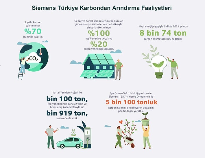 Yeşil enerjiye geçişle birlikte 2021 yılında 8 bin 74 ton karbon salımı tasarrufu sağlayan şirket, Kartal Yeniden Projesi ile bin 100 ton, filo yönetiminde daha az yakıt ve hibrit araç kullanımlarıyla ise bin 919 ton daha tasarruf elde etti. Ayrıca Ege Orman Vakfı iş birliğiyle kurulan Siemens 165. Yıl Hatıra Ormanı ile 5 bin 100 tonluk karbon salımını engelleyerek doğa için pozitif değer yarattı.