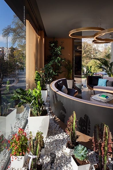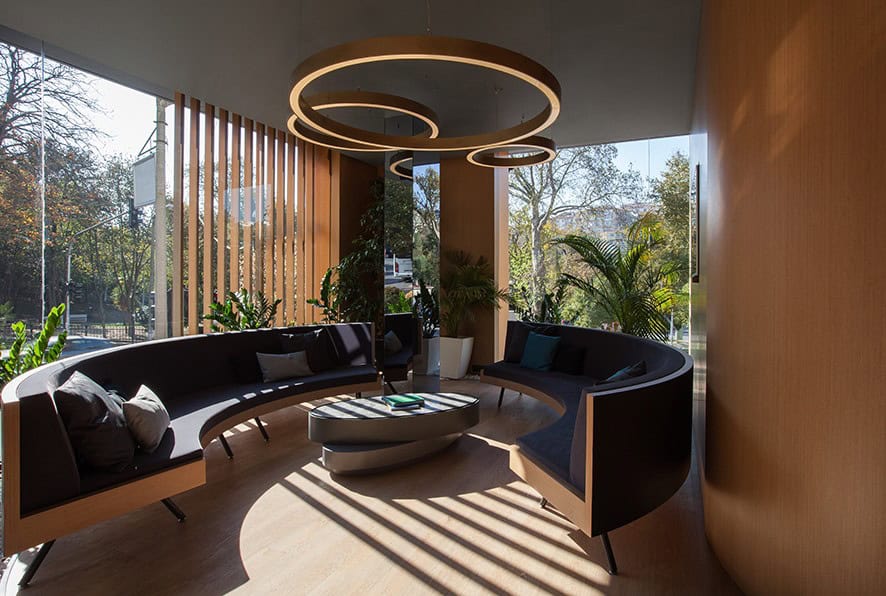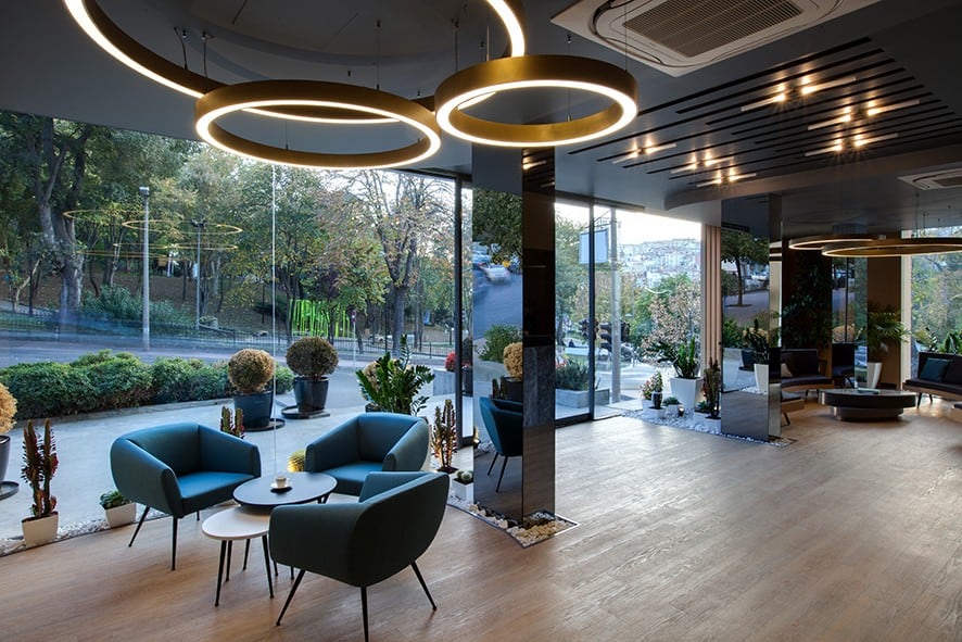 Klasik anlamda bilinen steril ve soğuk klinik algısı, yeşil zen bahçelerinin kurgulanması ve sıcak malzeme seçimleriyle yumuşatılmış, bekleme deneyimi için farklı kimliklerde oturma grupları tasarlanmış. Lobi bölümünde duvar ve zeminde yer alan doğal ahşap malzeme birlikteliğinin, kliniğin iç mahallerine doğru gidildikçe koridorlarda yerini sadeliğe ve minimal tasarım öğelerine bırakması amaçlanmış. Duvarların, şeffaf cam malzeme geçişiyle çözünerek yerini şeffaflığa bırakması sağlanmış. Bu yumuşak geçiş duvar yüzeylerinin kıvrılarak içeri doğru yönlenmesiyle desteklenmiş.