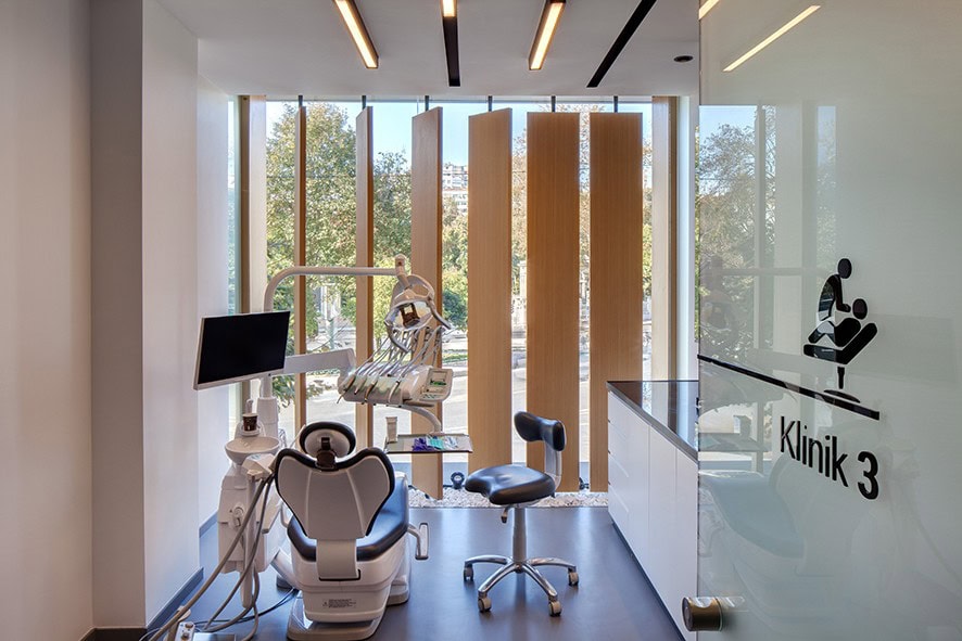 Tasarladıkları diş polikliniklerinde hastalarına güven duygusu verme fikriyle yola çıkan Slash Architects’in iç mekan ve cephe tasarımını üstlendiği klinik yapısı, İstanbul Fulya’da Ihlamur Kasrı manzarasına hakim, oldukça merkezi bir lokasyonda konumlanıyor. İki kattan oluşan 450 metrekare genişliğindeki poliklinik kurgulanırken, manzaradan maksimum fayda sağlamak hedeflenmiş. Polikliniğin zemin katında genel mahallere yer verilirken, üst kat personel odaları ve ofislere ayrılmış.