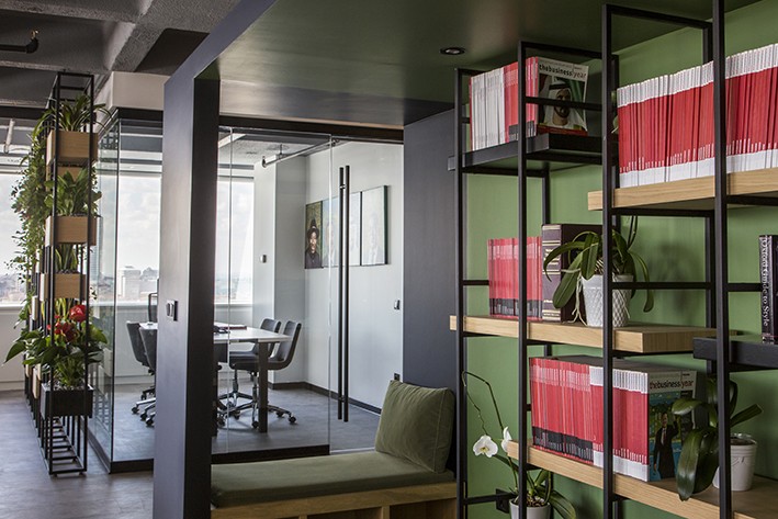 The Business Year’ın daha önceki ofisinde müstakil ve yeşille iç içe yaşam alışkanlıkları ve natürel kurgu, çeşitli ve nitelikli peyzaj elemanları ve bitkilerle oluşturulan geçirgen ve yarı geçirgen seperatörlerle yeni ofiste de devam ettirilmiş. Giriş bölümünde yer alan logo duvarına yerleştirilen teraryum’lardan başlayarak tüm ofiste kendini gösteren yeşil dokunuşlar, mobilyalarda yer alan saksı detaylarına kadar tasarımın önemli bir parçası olarak ele alınmış.