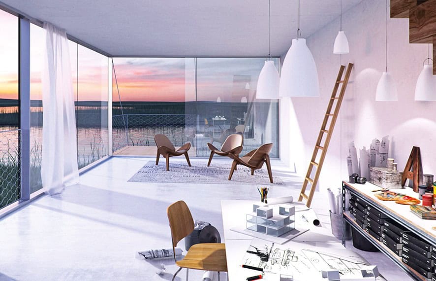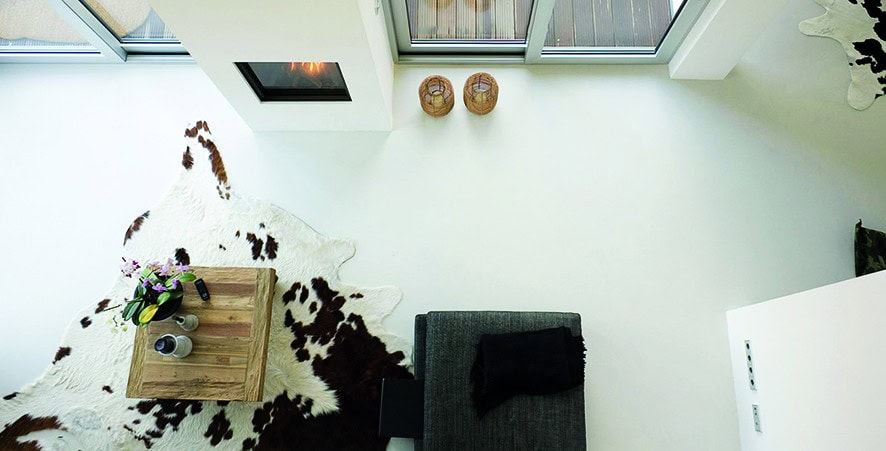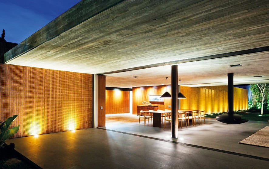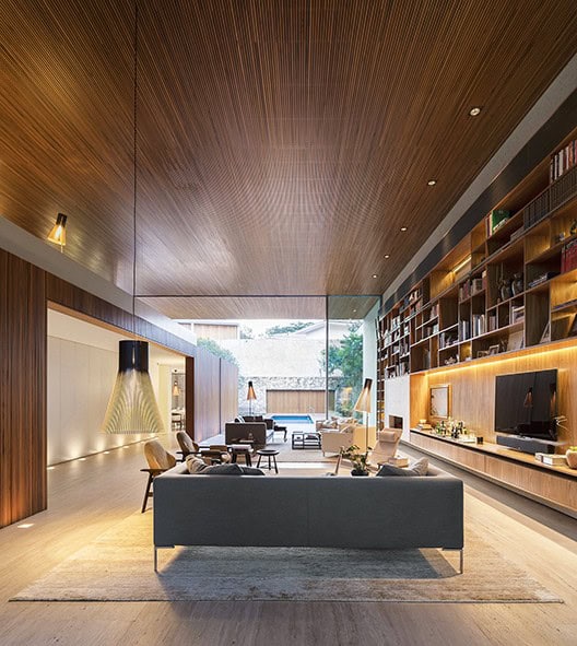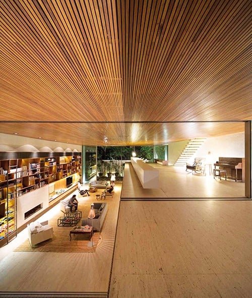 Ana oturma odasına bir ‘de dentro para dentro’ gezi yolu bakmakta, bu gezi yolu temel olarak bir iç mekân balkonu olarak düşünülebilir. İç tasarımcı Diana Radomysler bu unsur üzerinden aydınlık ve samimi bir çalışma alanı yaratmış. Bu balkondan ayrıca sıcak ve sevimli ahşap döşeme tavanı da açıkça görebilmekteyiz. Döşemeler tasarım ile uyumlu oldukları gibi aynı zamanda iklim kontrol işlevi de görmekte, Brezilya yazında bile gün içerisinde ısıyı çekip iç mekânı soğuk tutmakta.