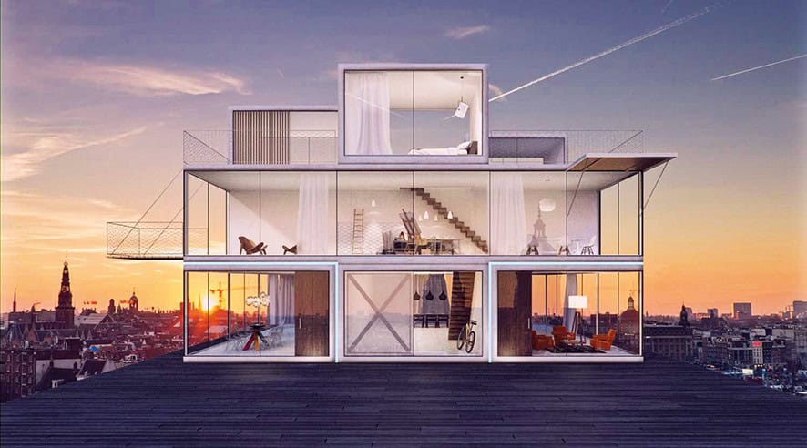 Janjaap Ruijssenaars “Yüzen Yatak,” (Time dergisi tarafından “en iyi icat” olarak seçilmiştir) “Manzara Evi” ve “Yerçekimi Enerjisi” gibi hayalperest tasarımları ile bilinen Universe Mimari’nin kurucusu Hollandalı mimar Janjaap Ruijssenaars, 1980’lerin video oyunu Tetris’in fikri ile oynayarak, sakinleri için 360 derece manzaraya imkan tanıyan yeni bir çeşit şehir evi tasarladı.