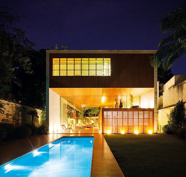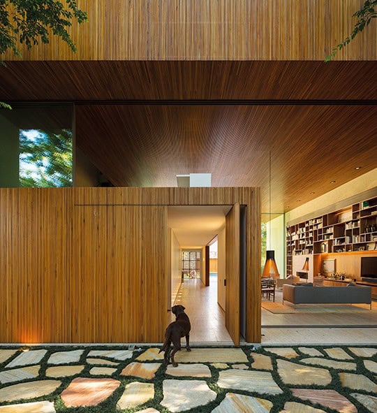 Dış kapıdan cepheye ve havuza kadar kullanılmış olan güzel ve doğal orman bu ev için çok hoş bir tema oluşturmuş. Ahşap panellerin birbirine geçme yöntemi ise evin her bir ünitesinin mükemmel bir tasarım ortaya koymak için nasıl rahatça bir araya geçtiğini ortaya koyan sadece başka bir örnek.