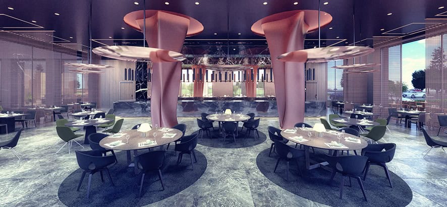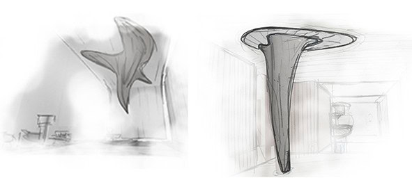 Taşıyıcı elemanları, net arka fon ile zıtlaşan heykelsi formlar olarak tasarlamış. Böylece, söz konusu ‘organik kolonlar’ sıvı akışkanlığında dondurulmuş hissi veren, bakılan her açıda algısı çeşitlenen bir odak noktasına dönüşmüş.