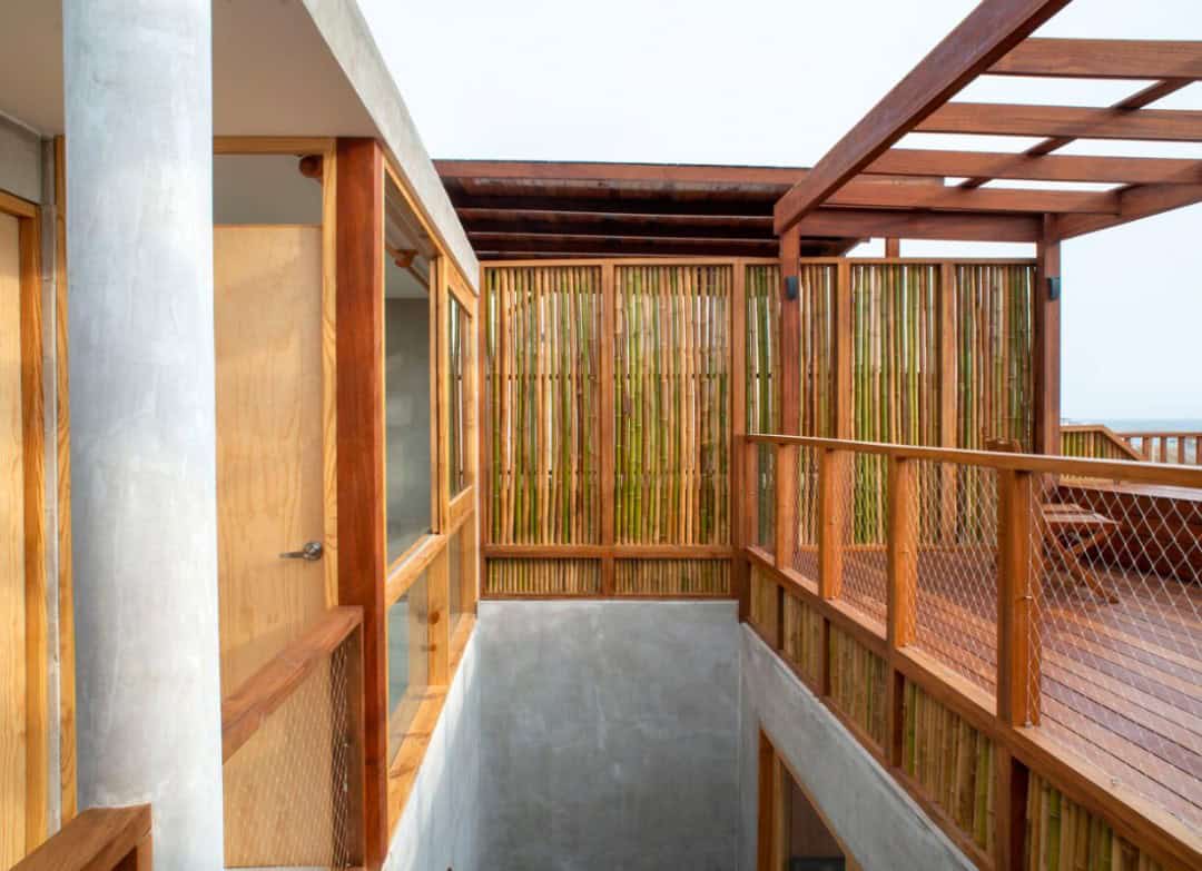 İki ev, tasarımın kompozisyon simetrisini takiben her biri kendi ton ve mekansal bağımsızlığına sahip üç seviyeye bölünme mantığını paylaşıyor. Sürdürülebilir mimari yapıda mekan şeffaf ve açık, esnek kullanıma izin verir ve dış mekanın bir uzantısı olarak günlük kullanımı kolaylaştırıyor. Alt katta bir veranda ve üst katta ahşap bir yürüyüş yolu ile iletişim kuruluyor. Sürdürülebilir mimari malzemeler iklime ve yerel sismik harekete dayanabilen düşük etkili malzemeler olan kireç, bambu ve ahşaptır. İnşaatı optimize etmek ve hızlandırmak için yapı elemanlarında donatılı kireç blokları, bölme elemanlarında ise basit bir sistem kullanılmış. Dik eğimli kumlu bir yamaçta yer alan beton kullanımı en aza indirilmiş ve zeminle temas eden yapılarla sınırlandırılmış.