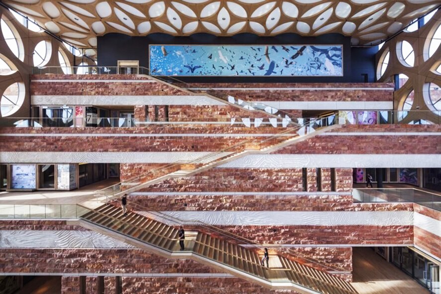 Güneş panelleri ve jeotermal ısı pompası sistemi gibi sürdürülebilir özelliklerin yanı sıra, yenilenen merkez, uzun ömürlülük sağlamak için dayanıklı doğal malzemelerle inşa edilmiş. Doğal taş, meşe, beton, cam ve çelik içeren yüksek dokulu bu malzemelerin zaman içerisinde yüzey görünümü değişecek ve bu da zamanın akışını gösterecektir.