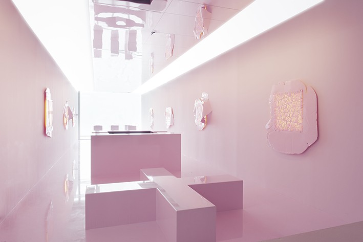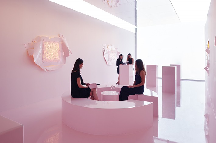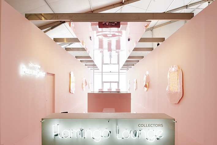 100 metrekarelik bu buluşma alanı boyunca kullanılan tek renk şeker pembesi ve mobilyalardan, duvarlara ve zemine, her eleman özel döküm yapılan reçine malzemeden elde edildi. Flamingo Lounge’un estetiğine, kült film yönetmeni John Waters’ın ihtişamlı debdebesinden, Mies Van Der Rohe’nin süsten ziyade yarar gayesi güden minimalizmine ve Gaetano Pesce’nin renkli akışkanlığına kadar bir dizi farklı kaynak esin verdi. Tabanlıoğlu Mimarlık’ın kendine has bir algıyla, Miami tarzı ve kültürü değerlendirmesini, keskin bir soyutlamayla ancak aynı zamanda oyunlu bir yaklaşımla tasarımına taşıdığı “koleksiyonerler salonu”, mimarların modernist yaklaşımını vurguluyor.