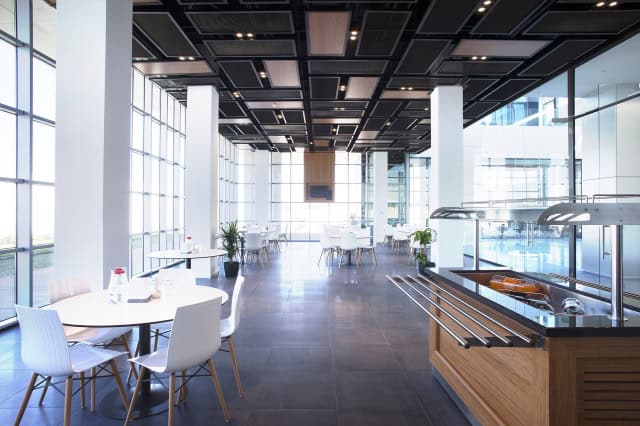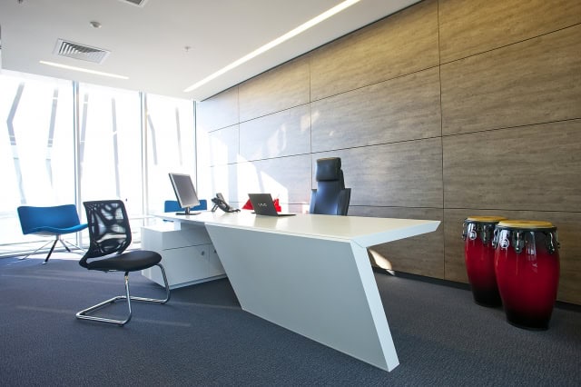 İki ayrı kütle olarak tasarlanan ofis binasında, kontrollü gün ışığı iç mekanlardaki önceliği oluşturmuş. Ofis ve sosyal mekanlar ile üretim bölümünü oluşturan bu iki kütle arasındaki geçişler, iç-dış mekan algılarını birbirine yaklaştıran şeffaf, cam tüp geçitler olarak düşünülmüş. Yapının plan şemasında ana giriş, su ögesi ve heykelsi konferans salon kütlesi ile vurgulanırken; giriş kat, büyük sergi alanı ve onu çevreleyen kafeterya, toplantı odaları gibi sosyal ve genel kullanıma açık mekanlardan oluşturulmuş. Bu mekanlar, hem ışıklık hem de yapıyı çevreleyen bahçeye ve havuza doğru uzanan konsol teraslar sayesinde gün ışığı ve dış mekanla bütünleştirilmiş.