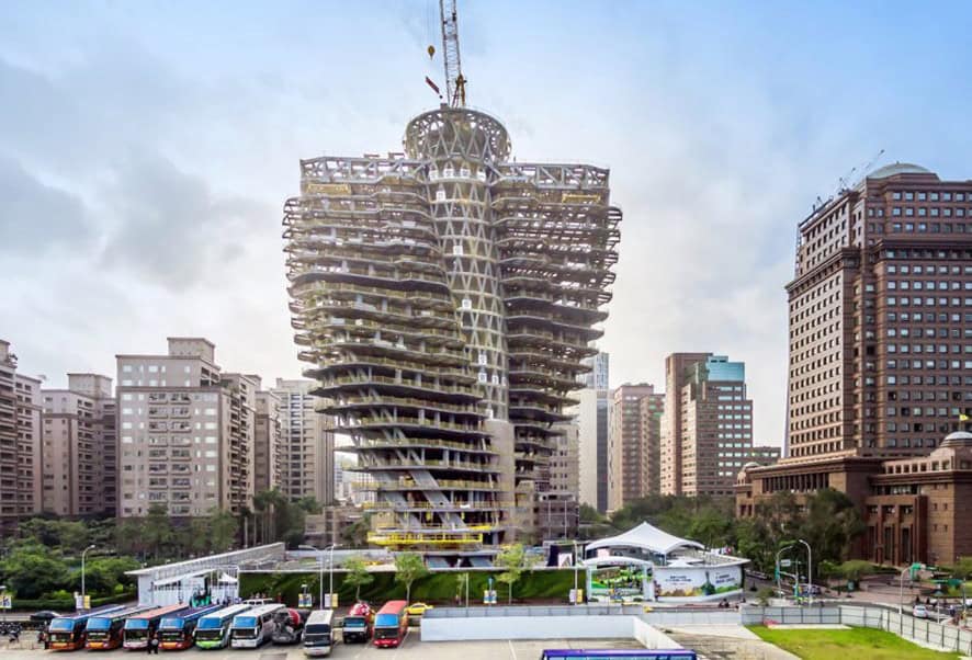 Paris merkezli Vincent Callebaut Architectures, 2021 yılının ikinci yarısında tamamlanması planlanan LEED Gold sertifikalı binası Tao Zhu Yin Yuan’ın yeni fotoğraflarını basınla paylaştı. Tayvan’ın başkentinin finansal merkezinde bulunan ödüllü dikey orman binasını mimarlar bir “anti-küresel ısınma ve karbon-emici eko sistem olarak tasarladı. Binada zeminde, balkon ve teraslarda 23.000 ağaç, bodur ağaç ve bitki bulunacak. Mimarlar 21 katlı binanın yılda 130 ton karbon emeceğini ön görüyor.