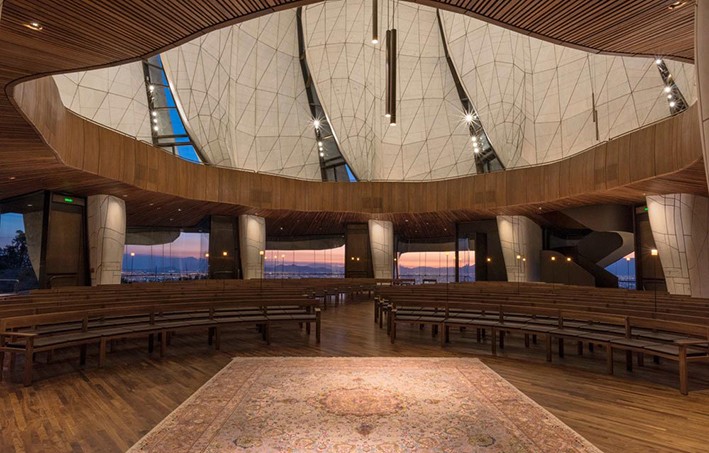 Tapınağın zarif manzarasına bağlı kalan iç mekânlar, ziyaretçilerin her birinin kendinden geçmiş bir ruh bulmasını sağlıyor. Hacimli kabuğa bağlı yaşam, yansıtıcı cam cephelerinden sızan ve süzülen yumuşak ışık kıvılcımları saçıyor. Ayrıca, kanatların rafine mermer iç kısmı, ziyaretçileri sıcaklık ve şefkatle yıkıyor. Ahşap sıraların tonozlu hatları insanları toplanmaya ve sessizce tefekkür içinde yan yana oturmaya ve insan zenginliğinin ortak eylemini paylaşmaya çağırıyor.