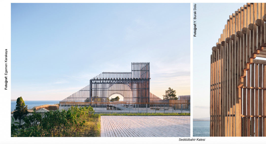 Seddülbahir’de, yeni müze yapısının kabuğunu kalenin yapımında kullanılan taş cinsinin büyük blok versiyonlarıyla örmemizin sebebi buydu; yeni yapının Silüette kaybolması, yanındaykense bugünün üretimi olduğunun anlaşılmasını istedik. Aynı projede ahşap elemanları, hem Bab-ı Kebir’in soyut tamamlamasında hem de kubbeli yapının yeni örtüsünde, özgün dokudan ayrışan ama onunla yarışmayan bir dil kurmak için kullandık.