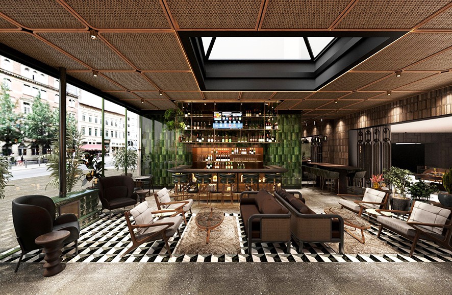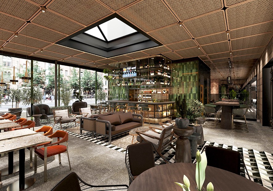 Lobideki deri kapıdan geçilerek ulaşılan kış bahçesi ve bar alanında lobiye referans vermesi için Apavisa markalı “Ocean Blue” porselen ve terrazzo görünümlü seramik birlikte kullanılmış. Tok duruşuyla dikkat çeken, vitrin olarak çalışan cam detaylı bar bu projeye özel tasarlanmış. Bar üstünde pirinç şaraplık düşünülürken tezgahın üstünde ise döner raflı şaraplık uygulanmış. Barın duvarı ördek yeşili Gorbon marka seramik, karşı duvardaki sedirin üstüne ise kiremit renkli, botanik desenli Arte duvar kağıdı uygulanmış. Siyah metal tavan ile hem mekana derinlik katmak hem de bitkilerin yürüyebileceği bir strüktür oluşturmak amaçlanmış. Rattan, deri ve eskitme bronz detaylı oturma elemanları yine Adasan Mobilya’dan seçilmiş.