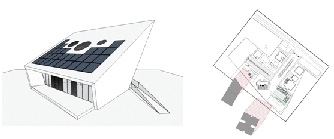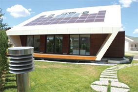 Mimari konsept olarak tek eğimde olması planlanan EkoEv’in çatı eğimi ise güneş enerjisi sistemlerinin yerleştirilmesine uygun olarak ayarlanmıştır. Şekil 1’deki fotoğrafta görüldüğü gibi çatıya elektrik enerjisi üreten PV paneller ve kullanım sıcak suyu için termal güneş kolektörleri yerleştirilmiştir.
