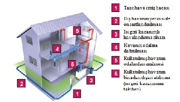 EkoEv’in arka bahçesinde 2 m derinlikte böyle bir H-TID sistemi kurulmuştur. Emiş bacası üzerinden alınan taze hava 83 m uzunluğunda borulardan geçirilerek ısı geri kazanımlı havalandırma cihazına getirilmiştir. Sistemin kullanımı ile yerleşim yerinde kış koşullarında karşılaşılabilecek -8oC’lik dış hava sıcaklığının 2,9oC’ye kadar ön ısıtılacağı, yaz koşullarında karşılaşılabilecek +35oC’lik dış hava sıcaklığının ise 25oC’ye kadar ön serinletileceği hesaplanmıştır. Yaz ve kış koşullarında ısı pompası cihazı üzerinden alınacak soğuk ve sıcak su ile sistemden alınan taze havanın ek olarak soğutulması ve ısıtılması, sonrasında da binaya üflenmesi gerçekleştirilmektedir. Yaz koşullarında alınan sıcak havanın serinletilmesi esnasında borular içerisinde yoğuşma oluşması durumunda, yoğuşan su bir toplama menholüne aktarılır ve burada toplanarak bir dalgıç pompa vasıtasıyla uzaklaştırılır. Bu sistemler ile ilgili şematik bir açıklama Şekil 4’te yer almaktadır.