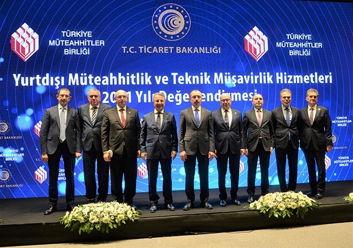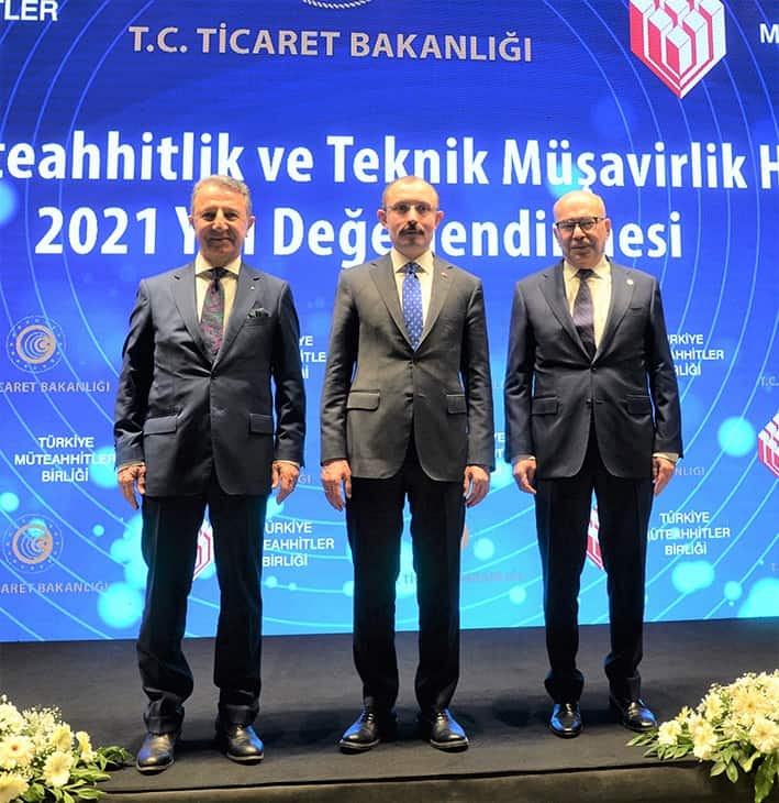 Sektörün 2021 yılı yurtdışı performansı ve 2022 yılı vizyonu ile hedefleri, Türkiye Müteahhitler Birliği’nin (TMB) ev sahipliğinde ve Ticaret Bakanı Mehmet Muş’un katılımıyla, TMB Başkanı M. Erdal Eren ile Türk Müşavir, Mühendisler ve Mimarlar Birliği (TürkMMMB) Başkan Yardımcısı İrfan Aker’in yer aldığı “2021 Yılı Yurtdışı Müteahhitlik ve Teknik Müşavirlik Hizmetleri Değerlendirme Toplantısı”nda ele alındı.