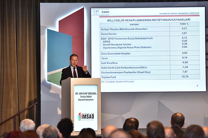 Türkiye İMSAD Ekonomi Danışmanı Dr. Can Fuat Gürlesel, TÜİK milli gelirde yaptığı revizyona değinerek yeni yöntemin BM’nin önerdiği ve AB’nin kullandığı bir yöntem olduğunu söyledi. Gürlesel’e göre, uluslararası alanda bu yöntemin değişmesinin ana sebebi teknolojik gelişmeler ve ilerlemeler nedeniyle daha önce ekonomik büyümenin içine katılmayan ar-ge harcamaları, teknolojik inovatif yenilikler özellikle yazılım gibi konuların ekonomik büyümeye katılması.