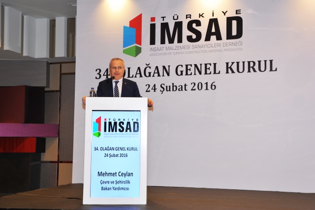 Çevre ve Şehircilik Bakanlığı olarak yaşanılabilir bir çevre ve marka şehirler oluşmasında en önemli hedefin yapı ve yapılaşmaya ilişkin bütüncül çözümler getirmek olduğuna dikkat çeken Bakan Yardımcısı Mehmet Ceylan, Türkiye İMSAD’ın çağrısına “Her türlü desteğe hazırız” yanıtını verdi. Türkiye İMSAD’ı inşaat malzemesi sektörüne yönelik yaptığı bilimsel çalışmalar, ekonomi raporları, endeksler ve akademik çalışmalarından dolayı tebrik eden Ceylan, inşaat malzemeleri sektöründe son 13 yıldaki büyüme ve diğer uluslararası gelişmelerin gurur verici olduğuna değindi. Ceylan “Ulusal Bina Yönetmeliği Platformu’nda Türkiye İMSAD’ın yanında olmaktan mutluluk duyarız. Sektör varsa biz de varız, etle tırnak gibiyiz. Bakanlık olarak da bu tür çalışmalara katkıda bulunmak zorundayız. Ülkemizde inşaat sektörü katma değer ve istihdam açısından lokomotif sektördür. Yüzlerce alt sektörü etkilemektedir. Yatırımların yaklaşık yüzde 50’si inşaat sektörüne yapılmaktadır. 2000’li yıllardan itibaren önemli gelişmeler kaydeden inşaat sektörünün öneminin bilincindeyiz” dedi.