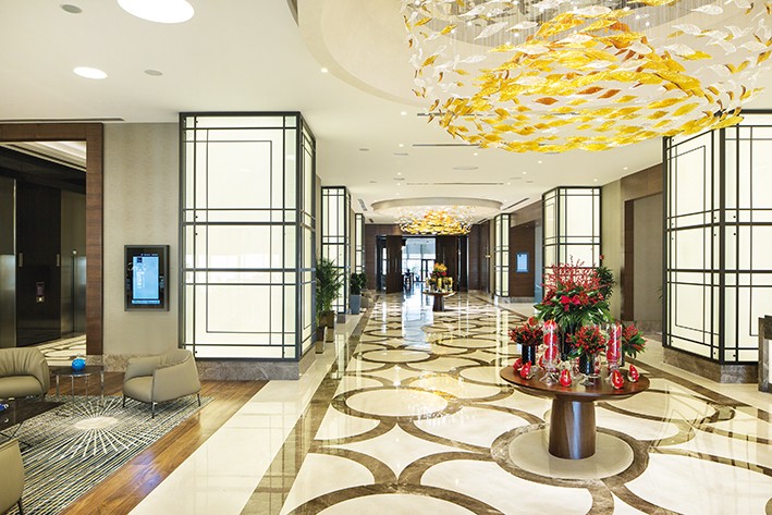 Özellikle otelin giriş katındaki lobisinde, ala carte restoran ve barında kısa görüşmeler yapılabileceği gibi bir alt katta çeşitli büyüklüklerde toplantı salonları ve balo salonu organizasyonların düzenlenebilmesi planlandı. Giriş katındaki tüm fonksiyonlar sokak etkisi verecek şekilde ana aks üzerine yerleştirilerek, aydınlık ve şık bir iç pasaj atmosferi yaratıldı. Aks üzerinde rüzgarda savrulan yaprak etkisinin soyutlandığı iki adet özel tasarım avize ünlü Çek aydınlatma firması Preciosa ile tasarlandı. Karşılama bankolarının arkasındaki duvarda ise Maya Romanoff markası İstiridye kabuklarından tasarlanmış özel bir duvar kağıdı kullanıldı.