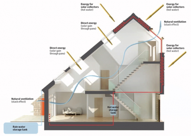 •Güneş ışınlarından gelen ısı, doğal havalandırma ve gün ışığından en yüksek düzeyde fayda sağlamak için pencereleri stratejik konumlandırmak,