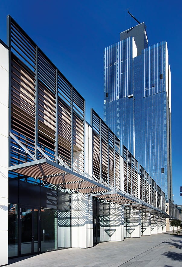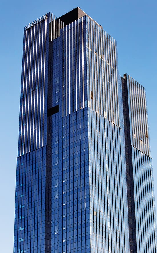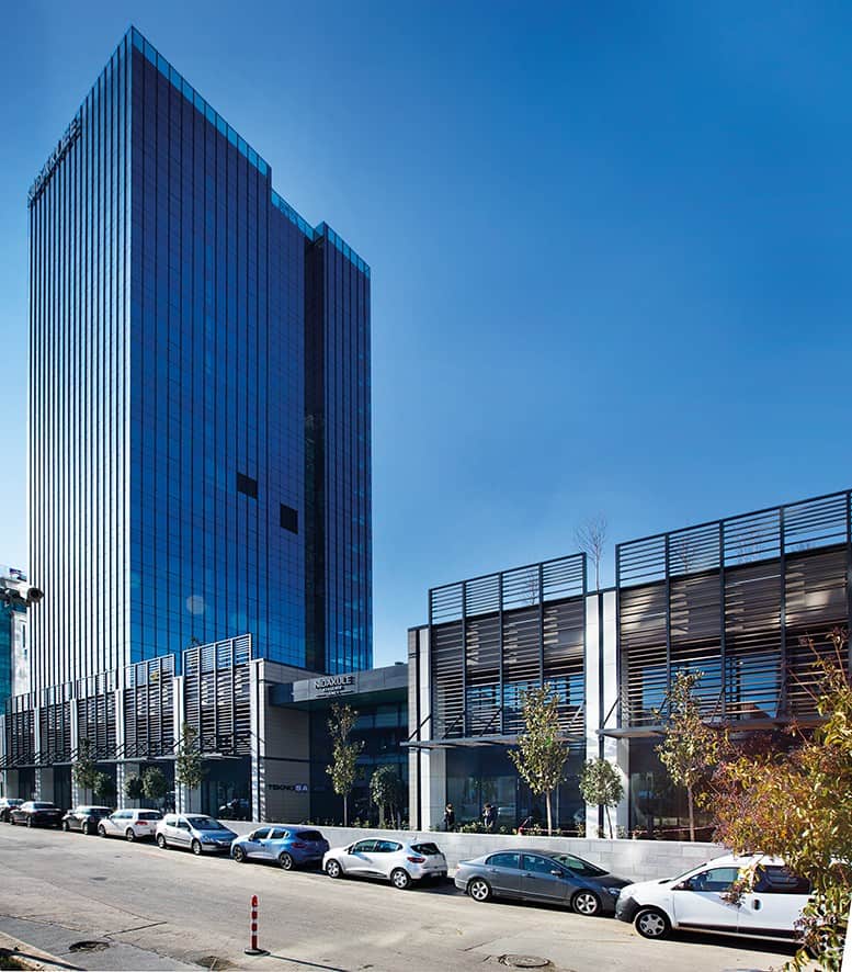 Finans Merkezi’nin hemen karşısında yer alan yapının cephe tasarımına özel önem verilmiştir. Giydirme cephenin 2/3’lük kısmında bir geçiş düzenlenmiş ve cephenin en üst bölümünün vurgulanarak kristal gibi parıldaması istenmiştir. Burada cephe bir miktar içeri çekilerek daha derin düşey cephe profilleri kullanılmış, alt bölgedekilerin aksine bu profiller açık renkli olacak şekilde boyanarak özel bir şekilde aydınlatılmıştır.