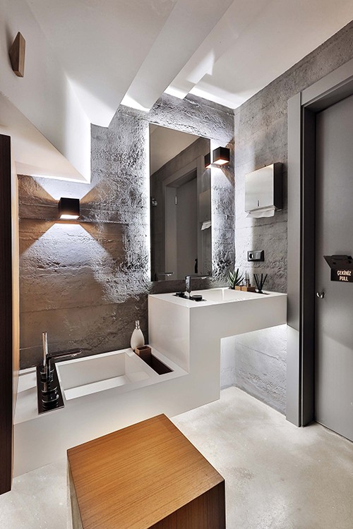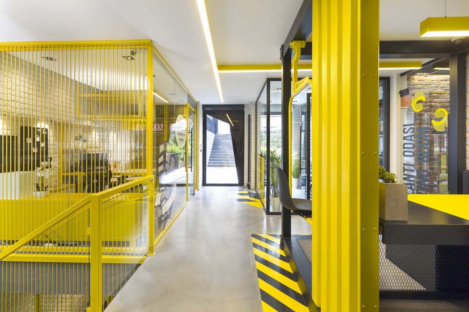 Yapıya adımınızı attığınız andan itibaren kendinizi şantiye ortamında hissetmenizi sağlayan dokunuşlar dikkati çekmektedir. Özellikle karşılama ve muhasebe bölümü, müdür odası, toplantı odası ve ortak wc’nin bulunduğu giriş katında hakim olan endüstriyel çizgi inşaat sektörünün temsilcisi sarı ve siyah renklerin vurgusuyla desteklenmiştir. Malzeme seçimleri ham ve doğal görünümü oluşturan materyaller arasından belirlenmiş, inşaat atmosferinin vazgeçilmezi brüt beton, epoksi, tuğla, demir profil ve mesh metal gibi malzemeler tasarımın yapı taşlarını oluşturmuştur.
