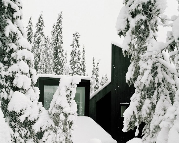 Norveç’te Gerçekleştirilen Kabin, Yükselen Çatı Yüzeyleri ile karlar arasından sivrilirken cephede tercih edilen koyu ton doğal peyzaj içinde monokrom bir görüntü sunuyor.