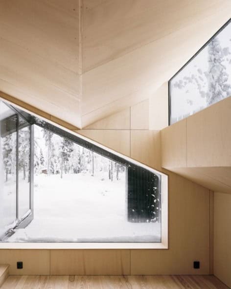 Çatıların oluşturduğu farklı yükseklikler, 55 metrekarelik kullanım alanını zenginleştiriyor. Ana yatak odasında, yatak seviyesinden gökyüzüne bakmak ve kuzey ışıklarını izlemek mümkün oluyor. 4 metrelik pencere açıklığının doğrultusu, kullanıcıya gökyüzünün altında ve ağaçların üzerinde duruyormuşçasına bir his veriyor.
