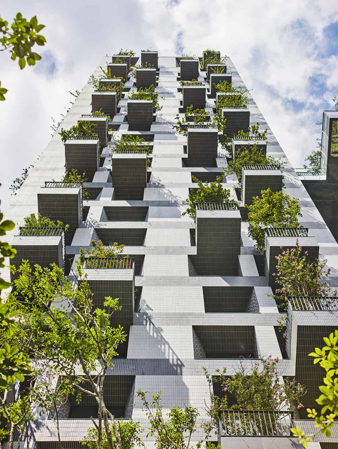Şehrin göbeğinde yer alan Sky Green, içerisinde konutların, perakende mağazaların ve çok sayıda eğlence tesisinin bulunduğu iki binadan oluşuyor. Biyofilik tasarım yaklaşımıyla ünlü olan WOHA, doğayı, yüksek katlı binalara taşımak için yeşil cepheli bir yapı hayal etmiş. A binasındaki dairelerin ağaçlı balkonları, B binasındaki dairelerinse daha yumuşak, yemyeşil sarmaşıklarla kaplı cepheleri var. Ayrıca her beş katta bir karşımıza çıkan gökyüzü bahçeleri, projenin doğal yaklaşımını vurgular nitelikte.