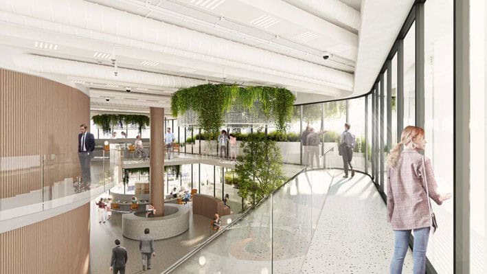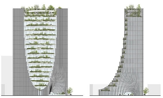 Gölgelik: Bina boyunca uzanan bitki örtüsü “şelalesi” şehri gökyüzüne bağlıyor, oksijen üretiyor, ışığı filtreliyor ve binada çalışanların refahını artırıyor.