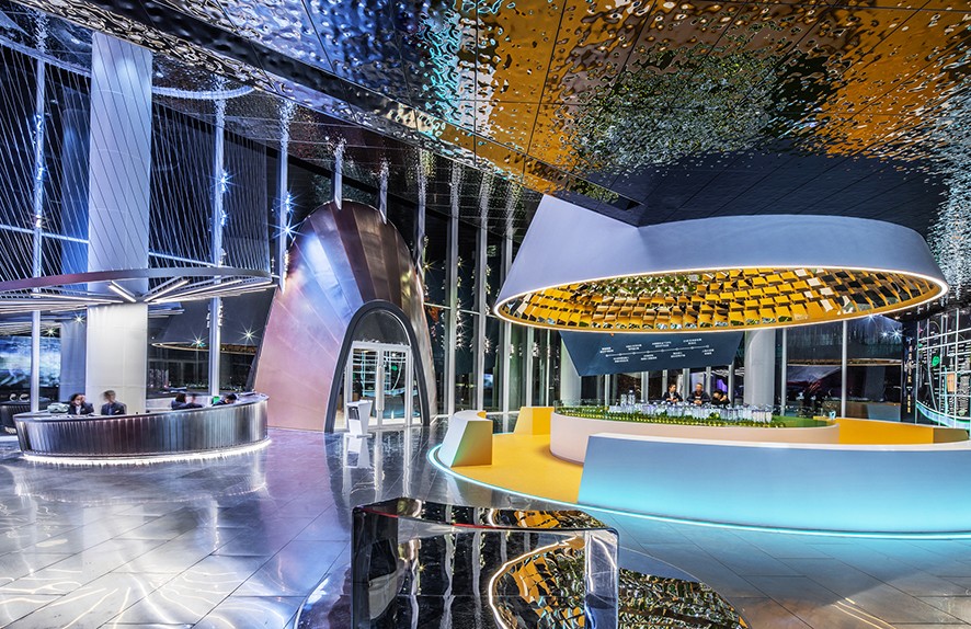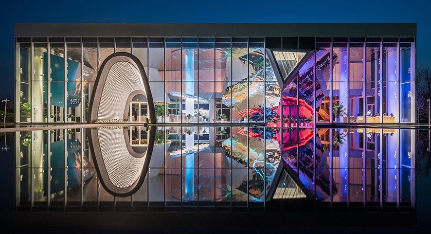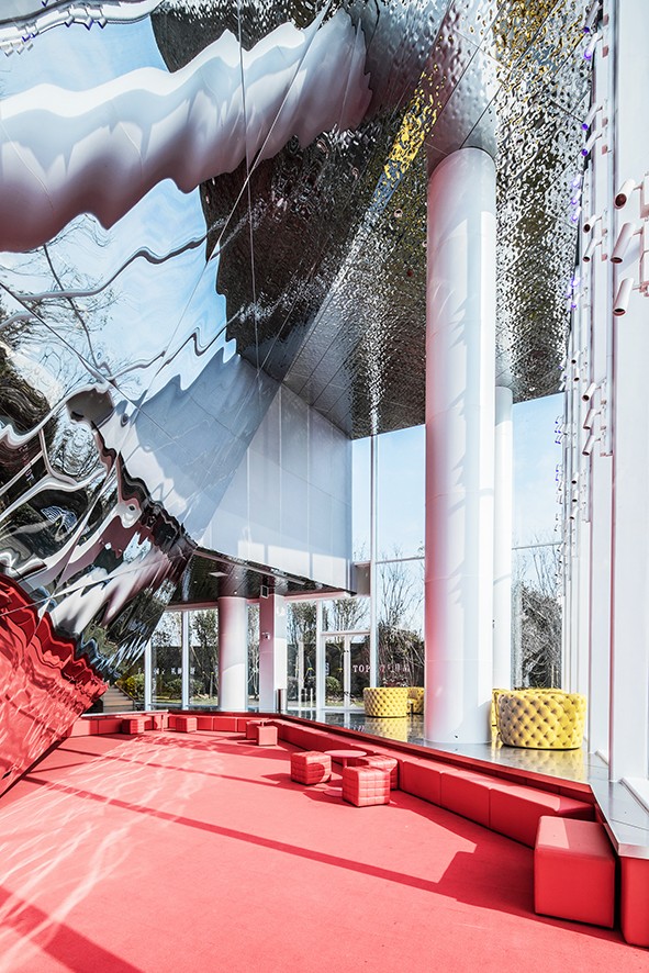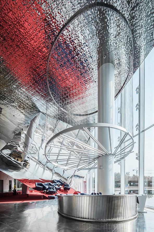 Havada yüzen nesneler zengin ve hiyerarşik bir alan oluşturuyor ve içeri girenleri, açık ve dinamik bir duruşla karşılıyor. Nesnelerin bazıları cam yüzeyle çarpışıyor ve camda bıraktıkları izler eşsiz bir mimari görüntü oluşturuyor. Bina cephesi, nesnelerin, alanların, malzemenin ve rengin iç kısımdan dış mekâna görünmesini sağlayan ultra beyaz camdan yapılmış.