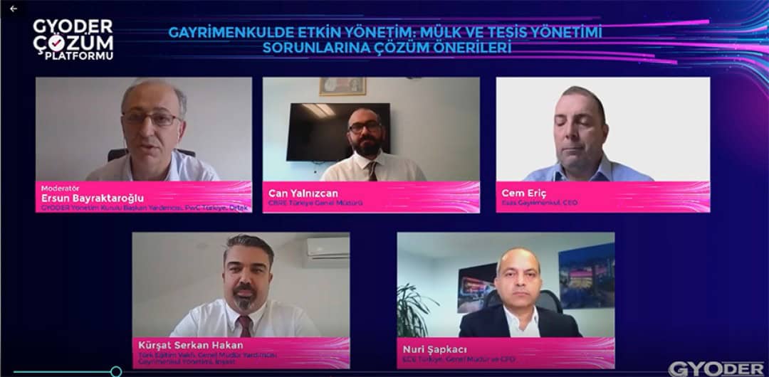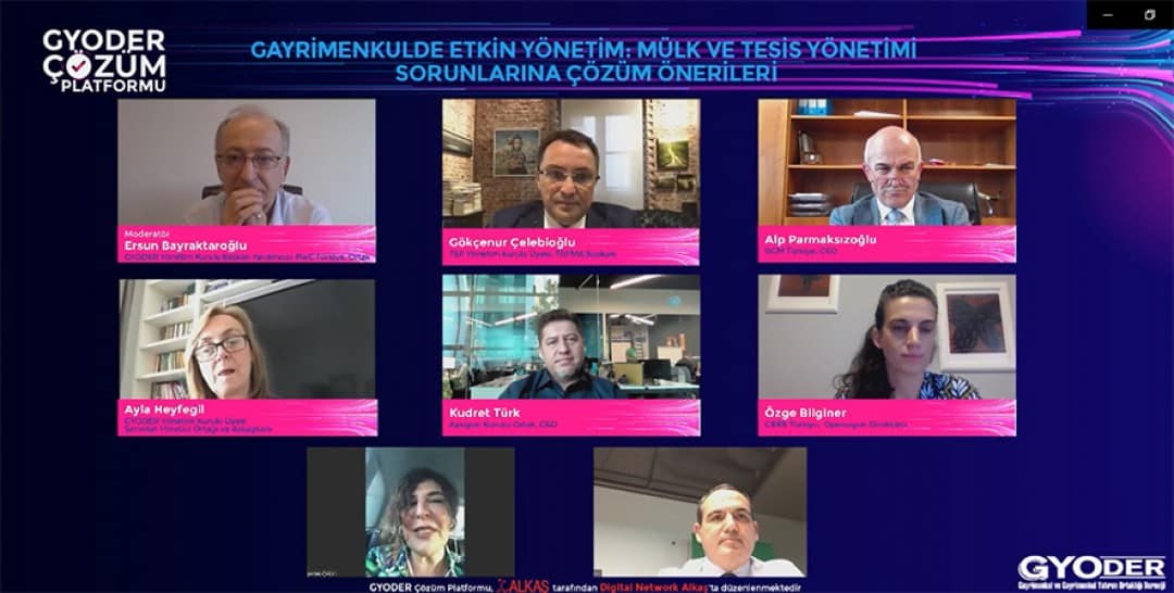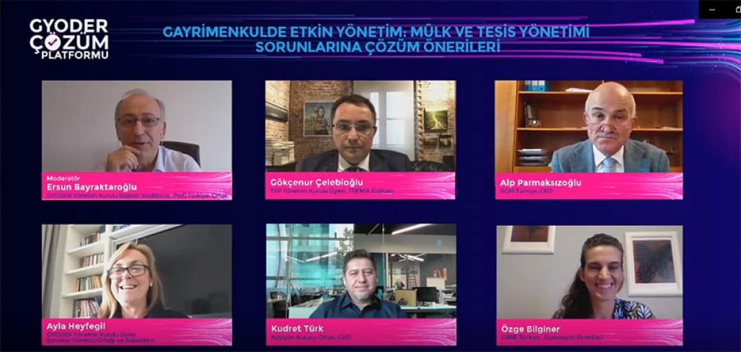 GYODER (Gayrimenkul ve Gayrimenkul Yatırım Ortaklığı Derneği) tarafından, gayrimenkul sektöründe yaşanan son gelişmeleri değerlendirmek ve yaşanan sorunlara çözüm bulmak amacıyla hayata geçirilen ‘GYODER Çözüm Platformu’ toplantısı, Digital Network Alkaş işbirliği ile ilk kez online platformda yapıldı. CBRE Türkiye’nin ana sponsorluğu, Endeksa, Apsiyon, Garanti BBVA’nın sponsorlukları ile 22 Ekim Perşembe günü ‘Gayrimenkulde Etkin Yönetim: Mülk ve Tesis Yönetimi Sorunlarına Çözüm Önerileri’ başlığı altında düzenlenen toplantıya gayrimenkul sektörü temsilcilerinin ilgisi yüksek oldu. Moderatörlüğünü GYODER Başkan Yardımcısı, PwC Türkiye Ortağı Ersun Bayraktaroğlu’nun yaptığı ‘Çözüm Platformu’ toplantısının konuşmacıları mülk ve tesis yönetimine yönelik değerlendirmelerini paylaştı.