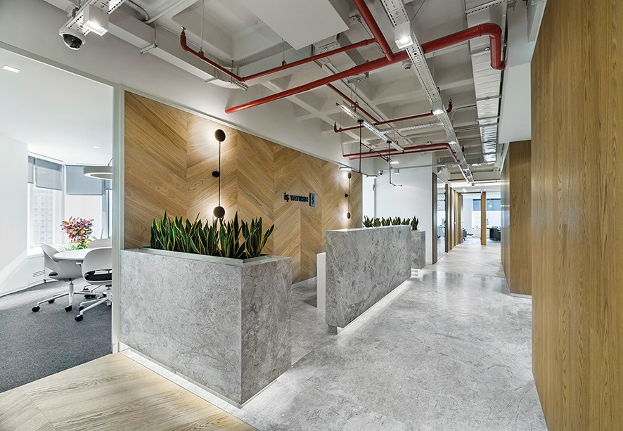 Her malzemenin bizim için avantajlı ve dezavantajlı yanları var. Örneğin ofislerde şeffaflığı sağlamak için kullandığımız cam ayırıcılar ve hijyen sebepli kullandığımız silinebilir yüzeyler ses yansıtıcı özelliği olan malzemeler. Bizim yaptığımız ise bu avantajlarını kullandığımız malzemelerin dezavantajlarını başka malzemelerle nötr hale getirmek. Örneğin son zamanlarda akustik tavan paneli yerine, yüksek teknoloji ürünü olarak geliştirilmiş akustik püskürtme kimsayal ürünlerle tavan yüzeylerini kaplamayı tercih ediyoruz. Tabii ki sürekli malzeme takibi yapıyor, mümkün olduğunca fuarları ve basılı-dijital yayınları takip etmeye çalışıyoruz. Yeni malzemeleri tanıyıp, teknik özelliklerini de iyice kavradıkça onları tasarımımıza göre nasıl şekillendireceğimizi de öğreniyoruz. Kısaca, elbette dönem dönem daha çok kullandığımız malzemeler mevcut ancak özellikle kullanmayı sevdiğimiz malzemeler var demek doğru olmayacaktır. Mekânın fonksiyonu ve bu fonksiyon açısından öne çıkan beklentiler seçimlerimizi belirliyor.