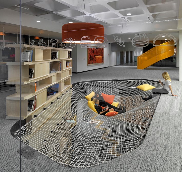 4. kattan 5. katın doğu kanadına kadar mevcut kat kesilerek tribün benzeri merdivenler, merdivenlerde de koltuklara bakan ekranlı perdeler yerleştiriliyor. Alan, kullanıcıların film izleyebilecekleri, spor müsabakaları veya konferans yapabilecekleri bir buluşma noktası oluşturmayı amaçlıyor. Bir hamak ağı ve 2 katlı kitaplık, bu alanı yine ikiye bölüyor. File, aynı zamanda boş zamanın değerlendirilebileceği bir sosyal alan olarak da hizmet vermektedir. Satranç ve diğer oyun özellikleri bu boş zaman etkinliklerinin bir parçasıdır. Renk bozulması sarı tonlarla tamamlanır. Katta müdürler tarafından özel toplantılar için kullanılan büyük bir toplantı odası bulunmaktadır. Ayrıca bu bölge, zemindeki dinamizmi destekleyen sarı merdivenlerle çatı katına erişime sahiptir.