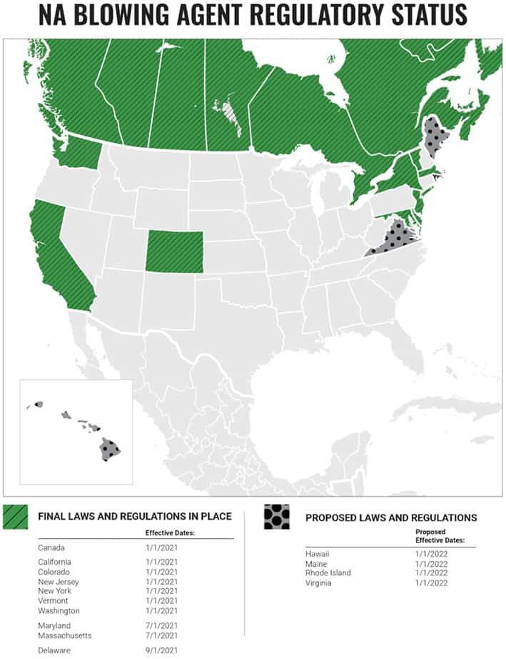 Hidroflorokarbon (HFC) kullanımını ve özellikle HFC-134a kullanımını kısıtlamayı amaçlayan düzenleme, tüm Kanada ve California, Colorado, Delaware, Maryland, Massachusetts, New Jersey, New York dahil olmak üzere, giderek artan sayıdaki ABD eyaleti için geçerlidir. Vermont ve Washington gibi daha da fazla eyalet benzer yasalar önerdi. Birçok eyalet, önümüzdeki aylarda çevre odaklı olan benzer düzenlemeler uygulamaya hazırlanıyor. Ulusal düzeyde, ABD ayrıca, HFC kullanımının azaltılmasını öngören bir anlaşma olan Montreal Protokolü’ndeki Kigali Değişikliğini onaylama sözü verdi. Giderek daha sıkı hale gelen çevre düzenlemelerini karşılamanın zorluğunu kabul eden birkaç XPS üreticisi, düşük GWP’li üfleme maddeleri kullanan XPS ürünlerini piyasaya sürdü.