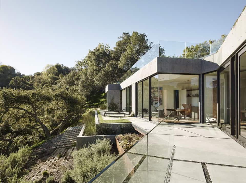 Avlularda kazanılan ışık ve hava evin diğer özel ve fonksiyonel alanlarına açıklık katmakta. Alt katın büyük bir kısmı yapıyı yamaca doğru katlayan ve yer üstünde yaşayan peyzajı evin çatısına çeken bitki örtüsüne sahip. Bu bitki örtüsü ve ağaçlar arasında yer alan su havuzu yansıma yaratarak manzara genişliğini ve mülkün çarpıcı özelliklerini vurgulamakta. Evin hem iç hem de dışında kullanılan malzeme paleti yeryüzünü anımsatmaktadır. İnşaat yöntemi ve bütünleşik haliyle ev topoğrafya içerisinde karakteristik bir izlenim yaratmakta…