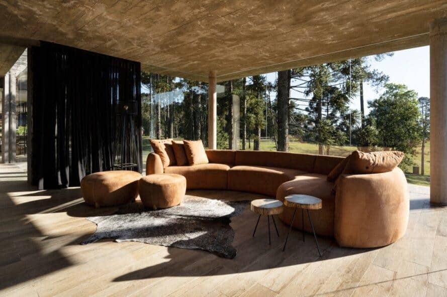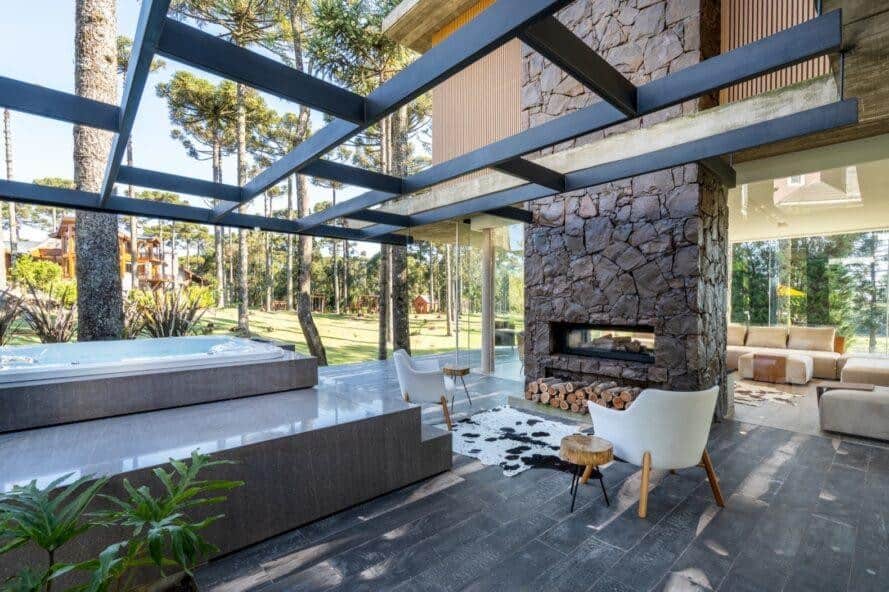 Doğal taş ve ahşap malzeme paleti, iç ve dış mekân arasındaki sınırları şeffaflaştırırken, sessiz bir renk şeması, yemyeşil dış ortama odaklanmaya devam ediyor. Binanın enerji ayak izini azaltmaya yardımcı olan güneş panelleri, yağmur suyu toplama sistemi ve geniş cam alanlarına ek olarak, çift yanmalı şöminelerde düşünülmüş. Bu şöminelerde, bitkisel bazlı yakıt kullanımını % 50’nin üzerinde azaltmak için etanol ve sertifikalı yakacak odun kullanılıyor. Ayrıca araziye yerel ağaçlar dikilerek binanın karbon ayak izini dengelenmeye çalışılmış.