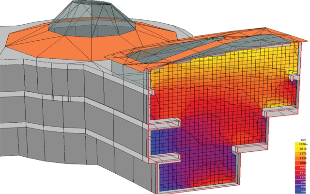 Cephe tasarım optimizasyon çalışmalarının bir diğer konusu da güneş kontrolü ile beraber gerekli doğal aydınlanma konfor şartlarının da oluşturulmasıdır. Cephe veyahut ışıklık sistemlerinden doğal ışığın istifade edilmesi maksadı ile yapılan Şekil 3’ deki gibi aydınlatma hesapları cam seçiminin iç ortamdaki doğal ışık seviyesinin düzeyi hakkında bize fikir verecektir. Bununla ilgili elde edilen veriler hem binanın yapay aydınlatma ihtiyacının optimizasyonunda hem de fazla ışınıma maruz kalan bölgelerde gerekli konforun sağlanması için cam yüzeyinde veya cephe önünde alınması gerekli önlemler hakkında kılavuz olacaktır. Cephe mühendisi cephe tasarımında gölgeleme araçları varsa bunların güneş kontrolüne katkısının belirlenmesi yahut etkinliklerinin artırılması maksadı ile Şekil 4’te gösterilen doğal aydınlanma simülasyon modelleri ile Şekil 5’te belirtilen türdeki gölgeleme araçlarının form, boyutları ve açıları ile ilgili optimum çözümü geliştirmeli ve buna göre cam panellerinin efektif gölgeleme değerini (G-value) belirlemelidir.