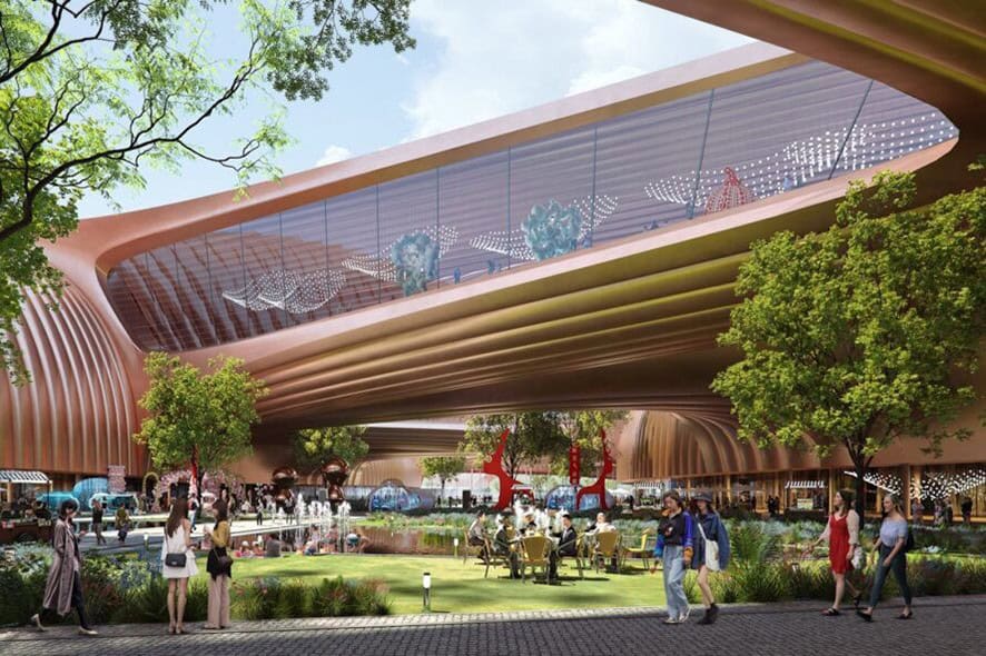 Çin’in geleneksel boru şeklindeki sırlı seramik fayanstan yapılan çatı kaplamalarından esinlenilen bakır renkli yeni binalar, kıvrımlı hatlara ve projeye fütüristik bir hava katan büyük yuvarlak pencerelere sahip. Binalara entegre edilen güneş enerjisi tertibatları ve akıllı bina yönetim sistemlerine ek olarak mimarlar ayrıca projenin ilerideki karbon ayak izini minimuma indirmek için modüler yapı ve fabrikasyon metotları kullanmayı planlıyor.