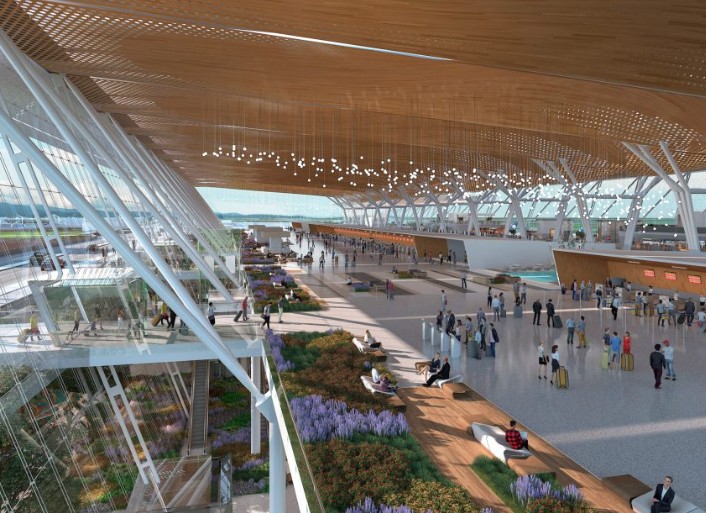 Yerel olarak yetiştirilen Douglas köknarıyla kaplı muhteşem bir merkezi merdiven ve heykelsi sütun, Miller Hull Ortaklığı ve Woods Bagot'un şehrin sürdürülebilir proje çerçevesinin bir parçası olarak Seattle-Tacoma Uluslararası Havalimanı'nı 150.000 metrekarelik genişletmesinin odak noktasıdır. İki inşaat firması, 2027'de tamamlanması beklenen genişlemenin, güneş çatı panelleri, elektrokromik cam ve fosil yakıtsız ısıtma sistemi gibi emisyon kontrol önlemleri ile karbon azaltma stratejilerine ve biyofilik teknolojiye odaklanacağını söyledi.