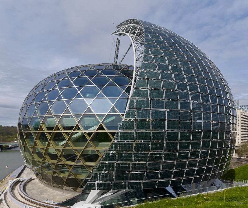 Fotovoltaik panellerden oluşan bir duvar, Shigeru Ban tarafından tasarlanan Paris yakınlarındaki camla çevrili bir müzik kompleksi olan La Seine Musicale'de güneşin yolunu takip ediyor.