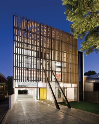 Geliştirme planı doğrultusunda alanın potansiyelini en yüksek ölçüde kullanmaktan da fazlasını hedefleyen binanın doğusunda 70’lerden kalan üç katlı bir ticari bina, batısında ise 1900’lerin başlarından kalma tek katlı bir konut binası bulunmakta. Binanın inşaatı bir depo inşaatını anımsatıyor, ki bu, ticari yapılarda sıkça görülen bir yöntem. Yapının hacmi bitişiğindeki iki binayla da uyum içinde yapılmış, ayrıca görülen hacim de kereste kaplamalarla azaltılmış, önünde bulunan Jakaranda ağacıyla da günışığından koruma sağlanılmış. Alandan ayrı bulunan otopark ise girişin dışında tamamen gizlenmiş. Kereste kaplama ile binanın girişinin buradan olduğu belirginleştirilmiş. Bölgede döşeme olarak kullanılan Güney Avusturalya Mintaro kerestelerinin kullanımı çevreye uyum sağlarken; beton, cam ve siyah boyanmış çeliklerle tezatlık yaratıyor.