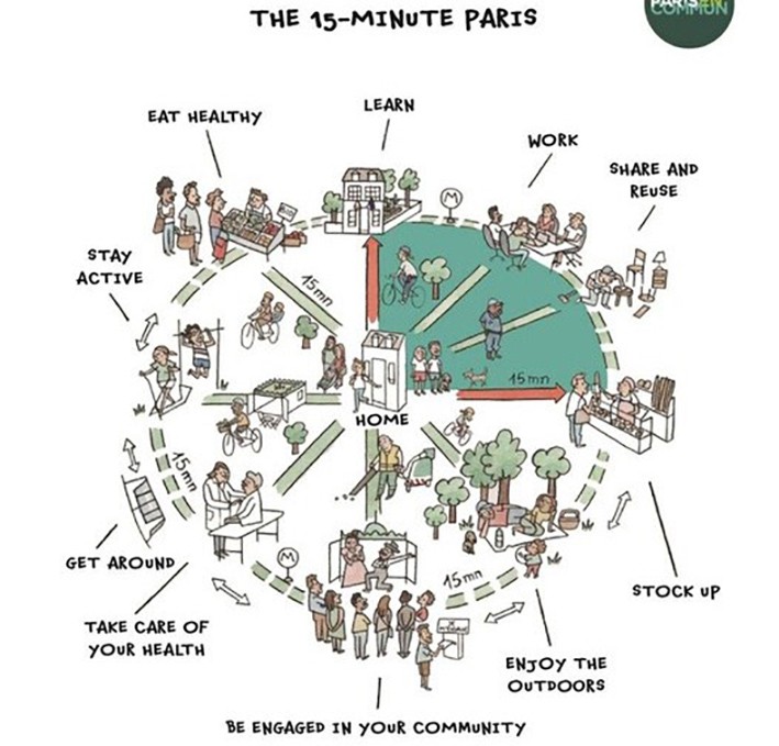 15 dakikalık şehir konsepti, kısa bir yürüyüş, bisiklete binme veya toplu taşıma yolculuğu içinde gerekli tüm olanaklara sahip olmayı ifade eder . Strateji, çalışma alanlarından işletmelere, rekreasyon, yeşil alanlar ve konutlara kadar kentsel yaşamın tüm yönlerini içeren her mahalle ile yerel ekonomiyi merkezsizleştirir. Teorinin temel özellikleri, insan ihtiyaçlarına dayalı bir şehir ritmi yaratmak, çok amaçlı mekanlar tasarlamak ve temel faaliyetler için başka yerlere gidip gelmekten kaçınmak için işlevsel bir çeşitlilik yaratmaktır. Sürdürülebilir kentsel tasarım düşüncesinin bir parçası olarak model, araba kullanımını ve karbon emisyonlarını azaltmaya yardımcı oluyor. Aynı zamanda bu model, daha fazla kamusal alan yaratırken işe gidip gelme süresini kısaltıyor.