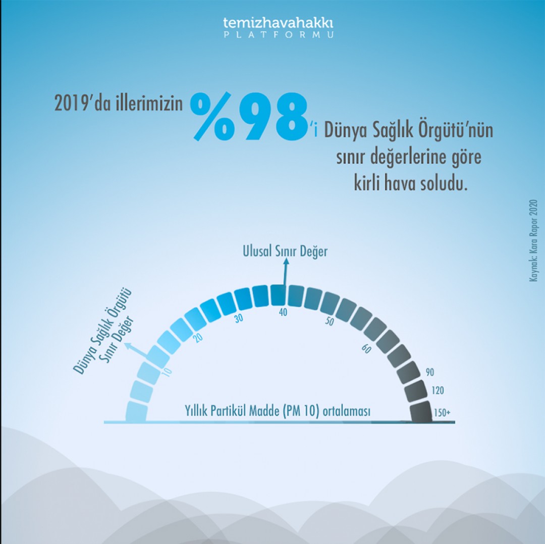 2019 yılında, Türkiye’de hava kirliliği, yeterli veri olan 51 ilin %98’inde Dünya Sağlık Örgütü (DSÖ)’nün sınır değerlerinin üzerinde gerçekleşti.
