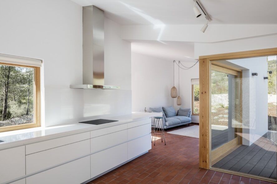 Mimarlar, orijinal taş duvarları onarmak ve birleştirmek için demir ve beton takviye kullandılar. Beton ayrıca mevcut duvarların yüksekliğini artırmak ve yeni bir çatı yapısı oluşturmak için kullanıldı. Yeni ek binanın dış duvarları pürüzsüz, beyaz yüzeyler olarak işlenmiştir. Büyük, ahşap çerçeveli pencereler, binaları görsel olarak birbirine bağlamak, eve bir sıcaklık hissi katmak ve dış manzara görünümlerini çerçevelemek için hem eski hem de yeni yapıyı noktalamaktadır. Işık dolu iç mekânlar, dış mekânların minimalist tasarım yaklaşımını, Akdeniz karakterini uyandırmak için seramik fayans içeren basit bir malzeme paleti ile eşleştirdiler.