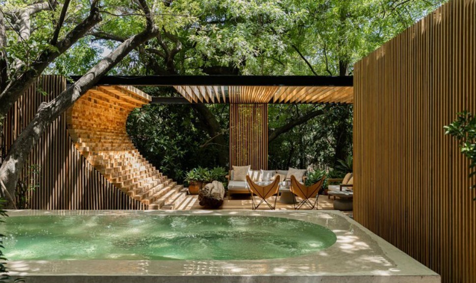 Casa Amapa Pérez Gómez Architectura, Meksika'nın Guadalajara kenti yakınlarındaki bir ormanda yer alan, çevreleyen yemyeşil bitki örtüsü ile uyumlu bir şekilde harmanlanan, açıkta kalan materyaliteye sahip soyut bir geometrik kat mülkiyetidir. Proje, bölgenin mevcut arazisini ve ormanlık alanlarını korumak için stratejik olarak konumlandırılmış. Gözlerden uzak yerlerde ortaya çıkan yapılar, minimalist bir yaklaşım benimsiyor ve insan yapımı ve doğal ortamlar arasında samimi bir sohbeti kışkırtmak için zeminden büyüyor.